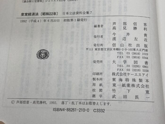 日本立法資料全集 7 信山社 芦部 信喜