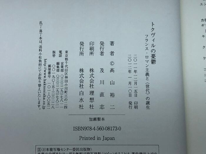トクヴィルの憂鬱: フランス・ロマン主義と〈世代〉の誕生 白水社 高山 裕二