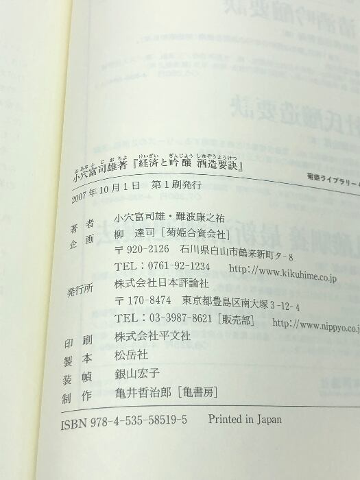 酒造要訣: 経済と吟醸 (菊姫ライブラリー 4) 日本評論社 小穴 富司雄